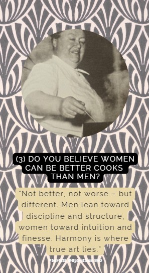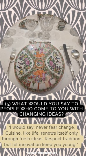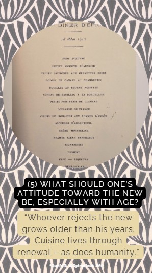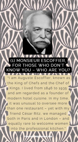 Why do I want to highlight him here? Because I often meet people who resist change. Escoffier, however, was a pioneer: rooted in tradition yet open to innovation. During my time at The Culinary Institute of America, I had the privilege of hosting his grandson. Imagine â his grandfather had already witnessed how many women were cooking professionally then, the so-called âgreat mothersâ of French cuisine: Mère Brazier, Mère Bourgeois, and Mère Fillioux, to name just a few.